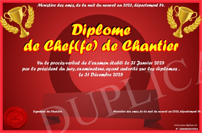 Envoyez par email votre Diplôme de Chef(fe) de Chantier personalisé