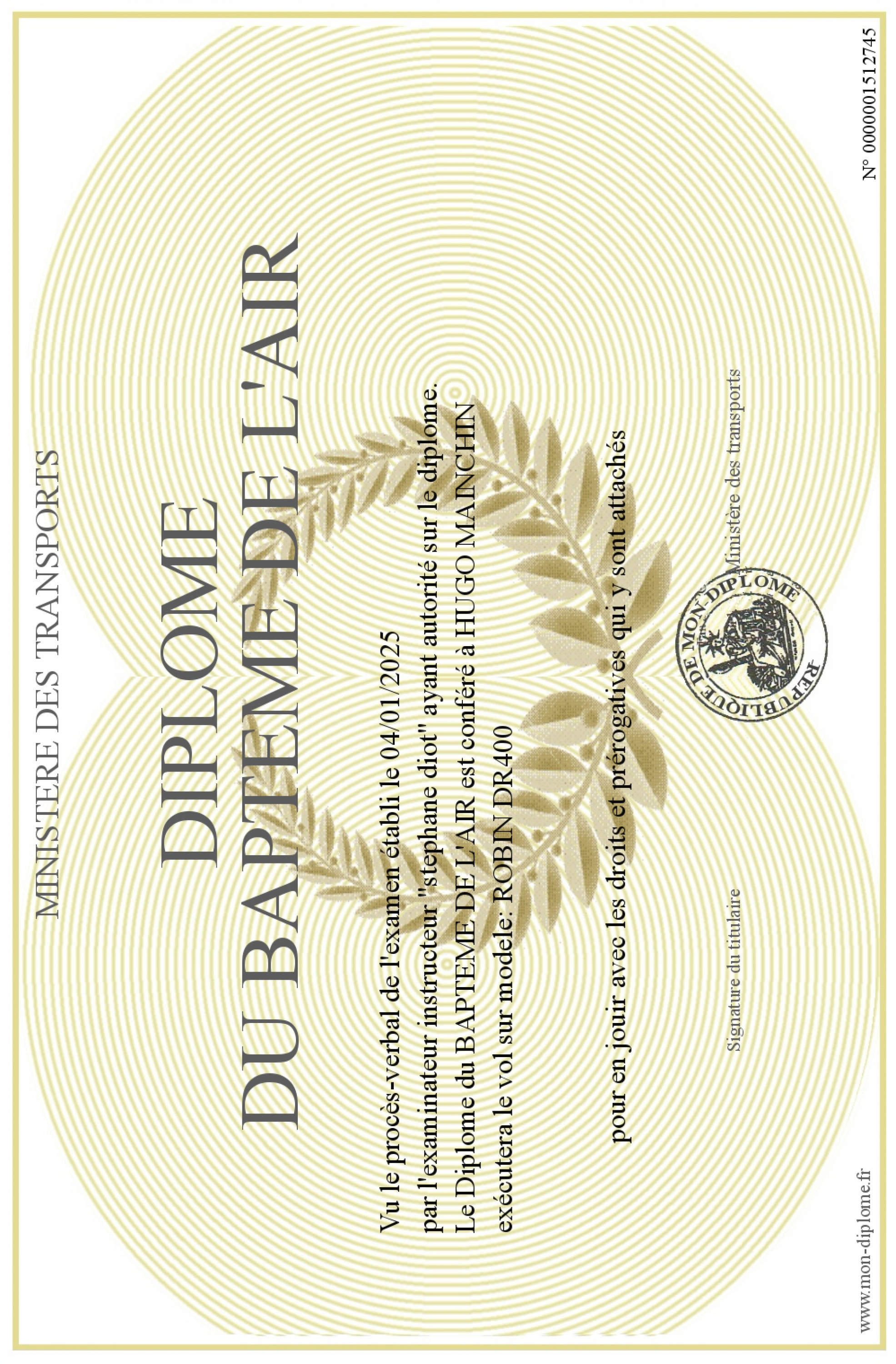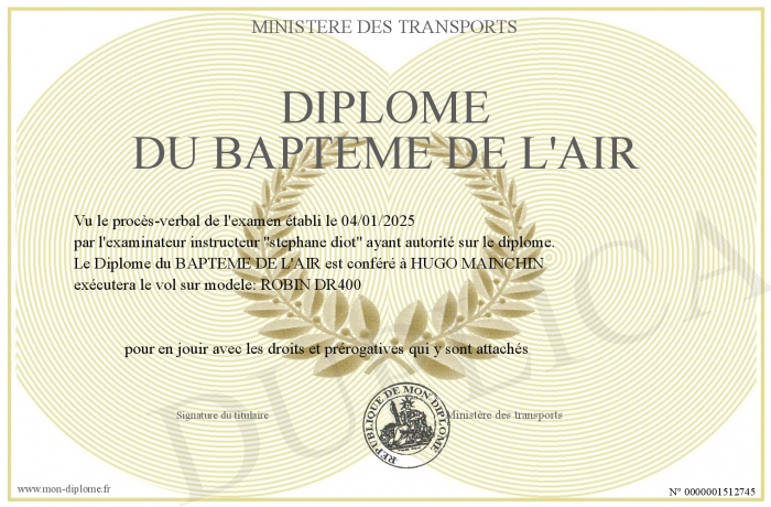 Envoyez par email votre Diplôme du BAPTEME DE L'AIR personalisé