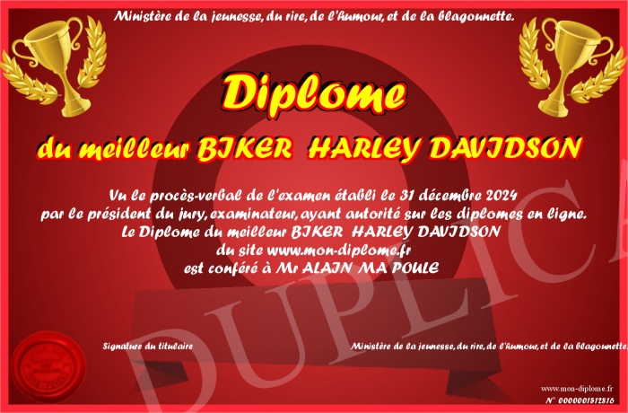 Envoyez par email votre Diplôme du meilleur BIKER HARLEY DAVIDSON personalisé