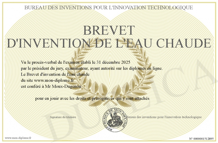 Envoyez par email votre Brevet d'invention de l'eau chaude personalisé