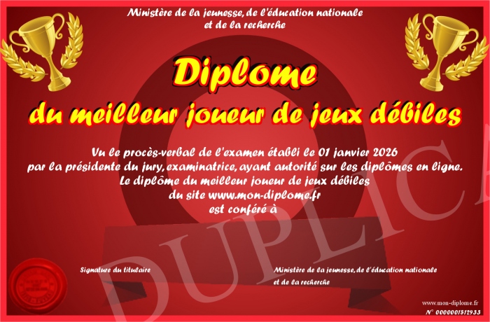 Envoyez par email votre Diplôme du meilleur joueur de jeux débiles personalisé