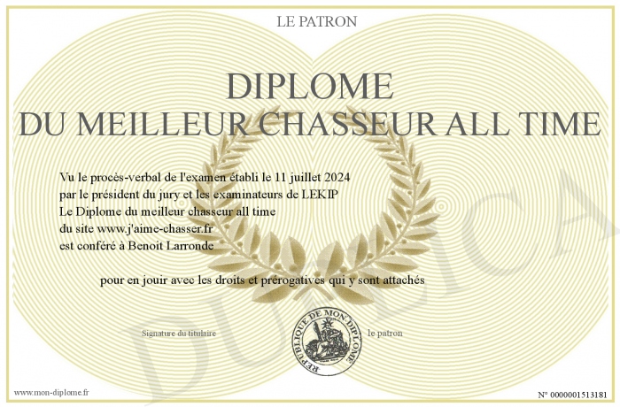 Envoyez par email votre Diplôme du meilleur chasseur all time personalisé