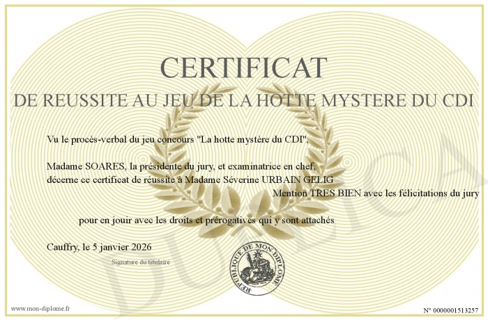 Envoyez par email votre Certificat de réussite au jeu de la hotte mystère du CDI personalisé