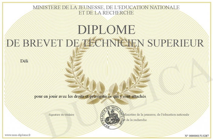 Envoyez par email votre Diplome de brevet de technicien supérieur personalisé