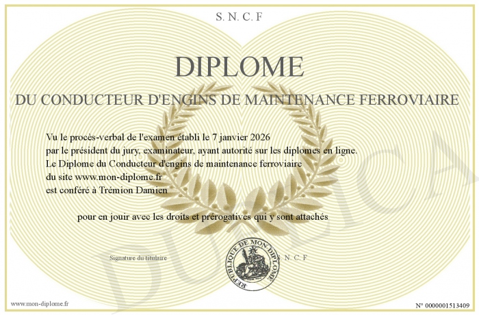 Envoyez par email votre Diplôme du Conducteur d'engins de maintenance ferroviaire personalisé