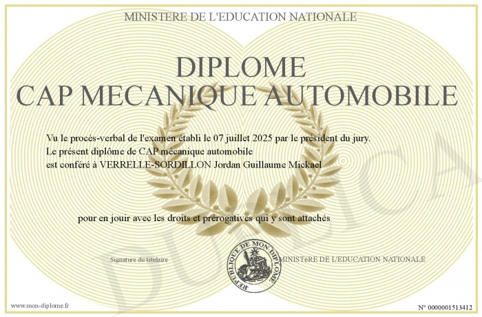 Envoyez par email votre DIPLOME CAP MECANIQUE AUTOMOBILE personalisé