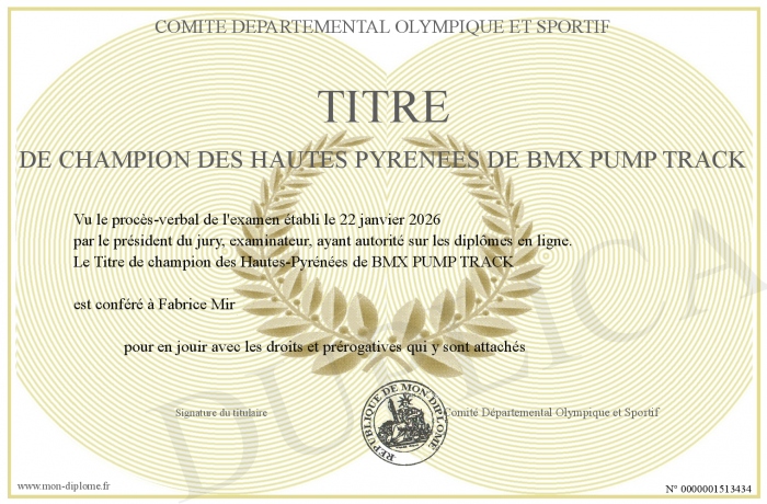 Envoyez par email votre Titre de champion des Hautes Pyrénées de BMX PUMP TRACK personalisé