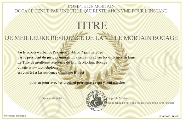 Envoyez par email votre Titre de meilleure résidence de la ville Mortain Bocage personalisé