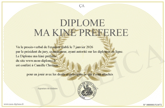 Envoyez par email votre Diplôme ma kiné préférée personalisé