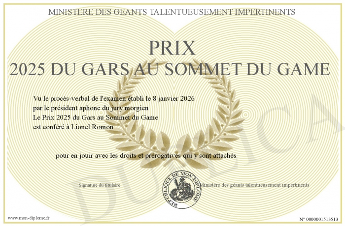 Envoyez par email votre Prix 2025 du Gars au Sommet du Game personalisé
