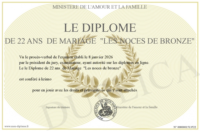 Envoyez par email votre le Diplôme de 22 ans de Mariage -Les noces de bronze- personalisé