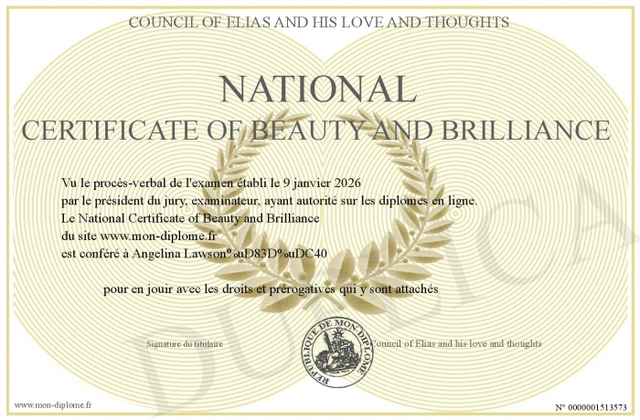 Envoyez par email votre National Certificate of Beauty and Brilliance personalisé