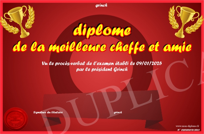 Envoyez par email votre diplome de la meilleure cheffe et amie personalisé
