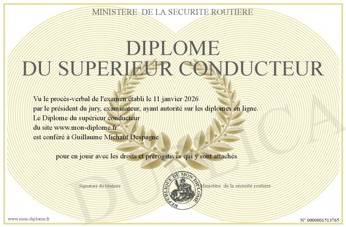 Envoyez par email votre Diplôme du supérieur conducteur personalisé