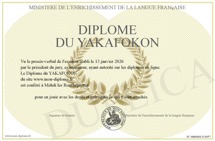 Envoyez par email votre Diplôme du YAKAFOKON personalisé