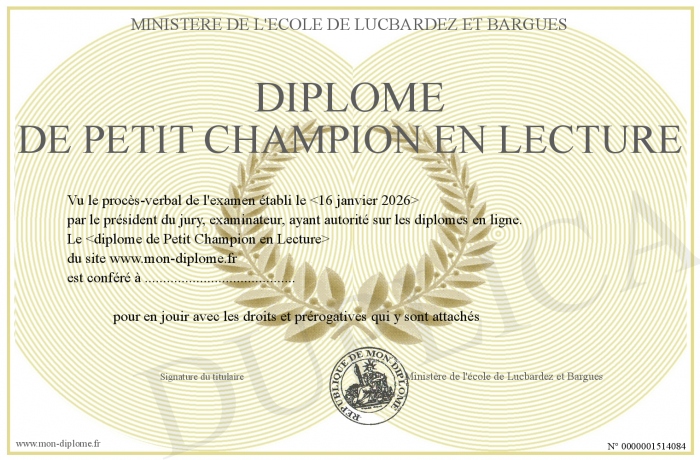 Envoyez par email votre Diplôme de Petit Champion en lecture personalisé