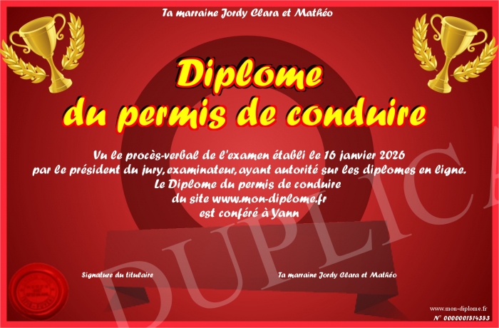 Envoyez par email votre Diplôme du permis de conduire personalisé
