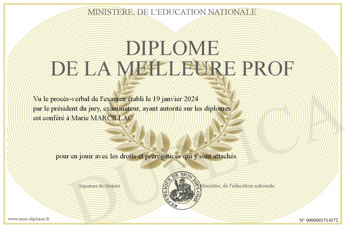 Envoyez par email votre Diplôme de la meilleure prof personalisé