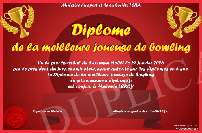 Envoyez par email votre Diplôme de la meilleure joueuse de bowling personalisé