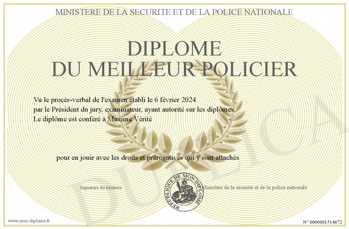 Envoyez par email votre Diplôme du Meilleur Policier personalisé