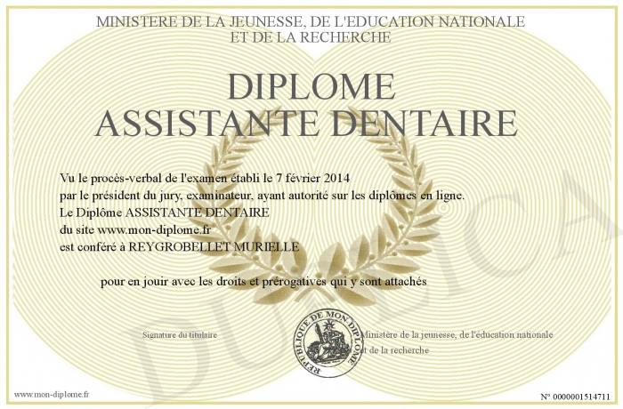 Envoyez par email votre DIPLOME ASSISTANTE DENTAIRE personalisé