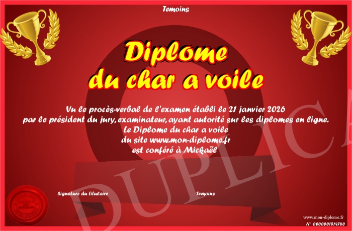 Envoyez par email votre Diplôme du char a voile personalisé