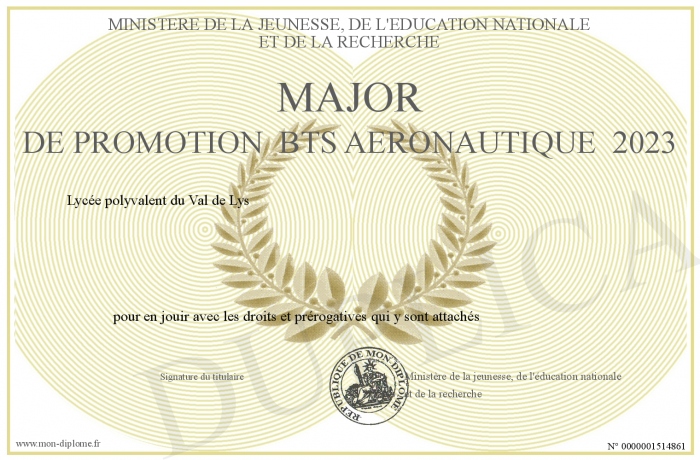Envoyez par email votre Major de Promotion BTS aéronautique 2023 personalisé