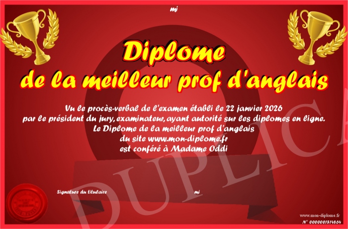 Envoyez par email votre Diplôme de la meilleur prof d'anglais personalisé