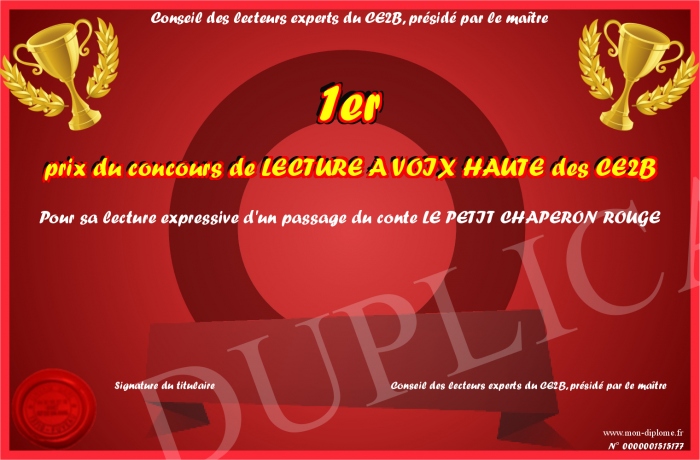 Envoyez par email votre 1er prix du concours de LECTURE A VOIX HAUTE des CE2B personalisé