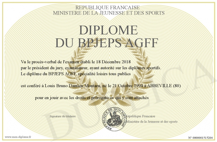 Envoyez par email votre Diplôme du BPJEPS AGFF personalisé