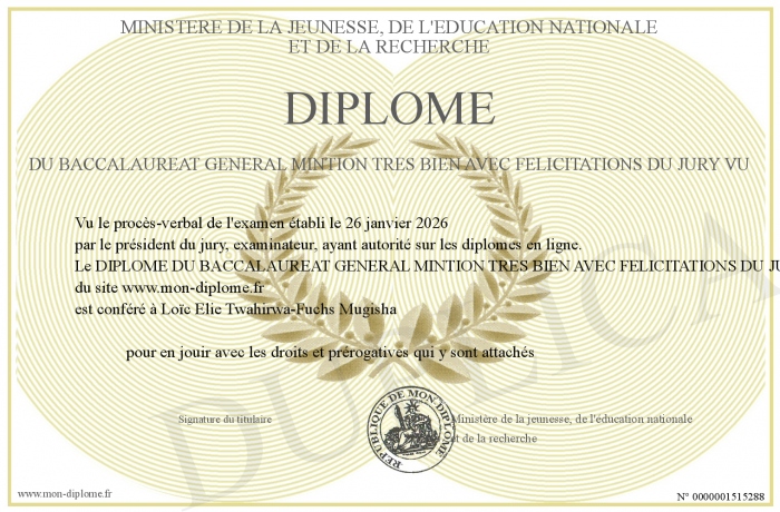 Envoyez par email votre DIPLOME DU BACCALAUREAT GENERAL MINTION TRES BIEN AVEC FELICITATIONS DU JURY Vu personalisé