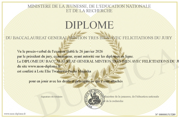 Envoyez par email votre DIPLOME DU BACCALAUREAT GENERAL MINTION TRES BIEN AVEC FELICITATIONS DU JURY personalisé
