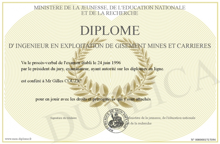 Envoyez par email votre Diplôme D' Ingenieur en Exploitation de Gisement MInes et Carrières personalisé