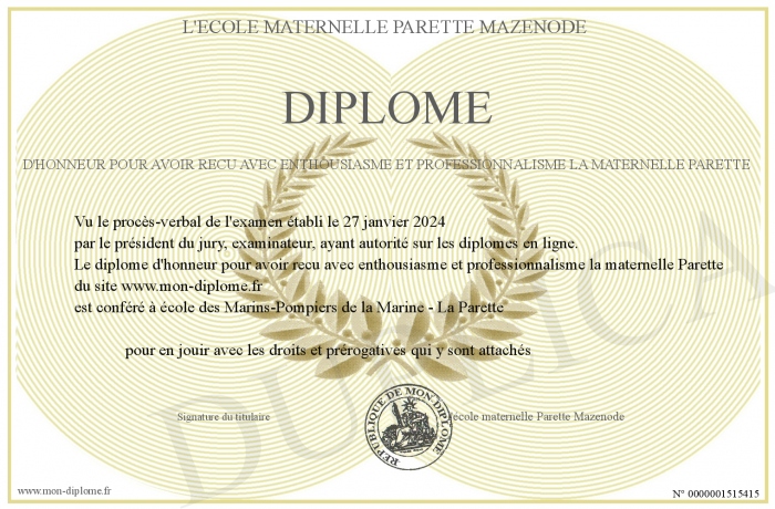 Envoyez par email votre diplôme d'honneur pour avoir recu avec enthousiasme et professionnalisme la maternelle Parette personalisé
