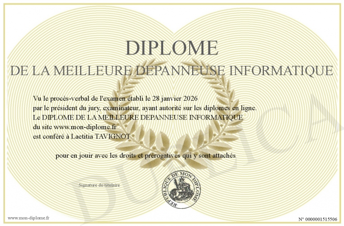 Envoyez par email votre DIPLOME DE LA MEILLEURE DEPANNEUSE INFORMATIQUE personalisé