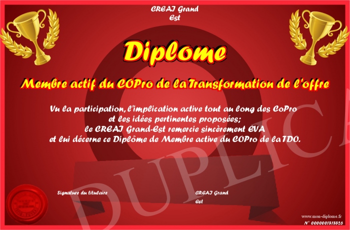 Envoyez par email votre Diplôme Membre actif du COPro de la Transformation de l'offre personalisé