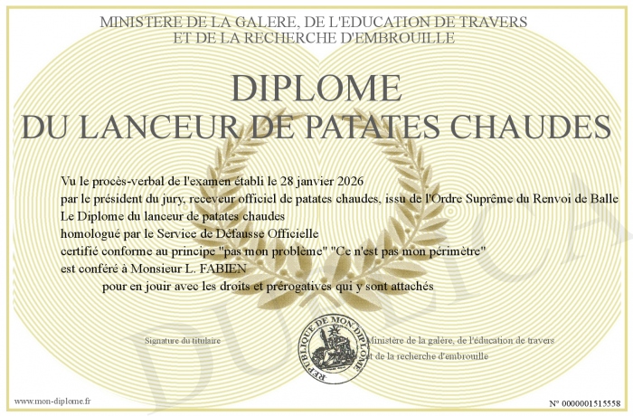 Envoyez par email votre Diplôme du lanceur de patates chaudes personalisé
