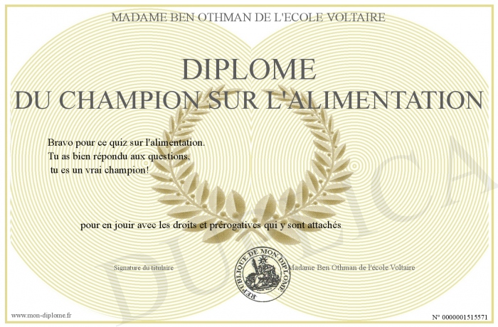Envoyez par email votre Diplôme du champion sur l'alimentation personalisé