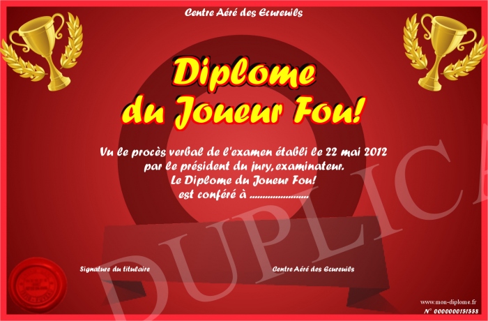 Envoyez par email votre Diplôme du Joueur Fou! personalisé