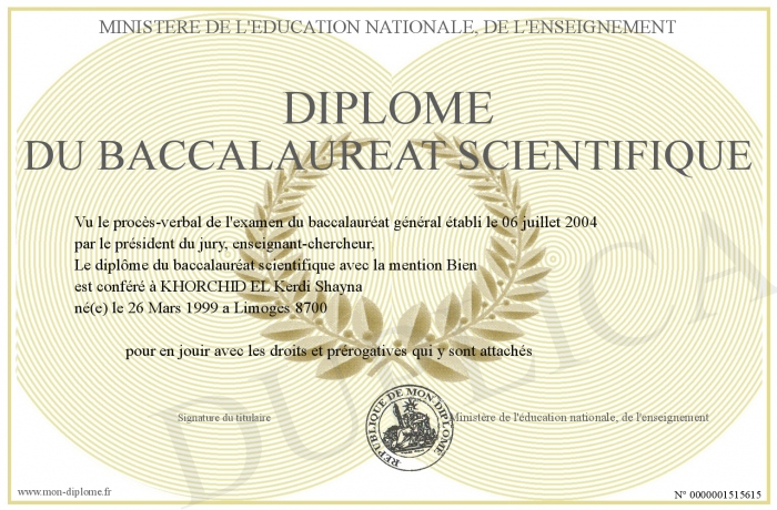 Envoyez par email votre Diplôme du baccalaureat scientifique personalisé