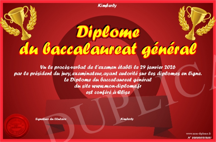 Envoyez par email votre Diplôme du baccalaureat général personalisé