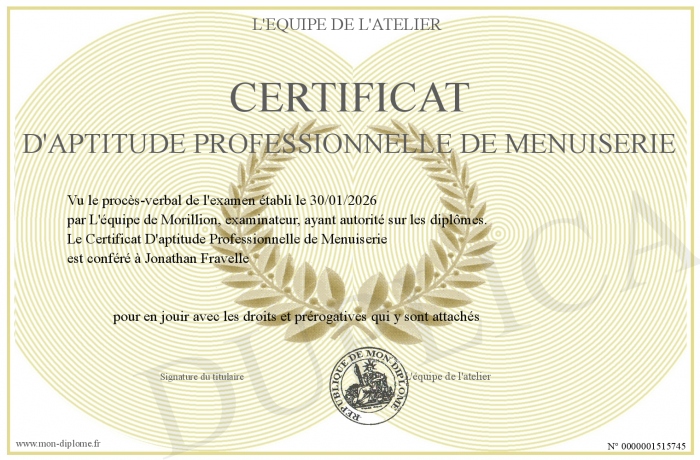 Envoyez par email votre Certificat D'aptitude Professionnelle de Menuiserie personalisé
