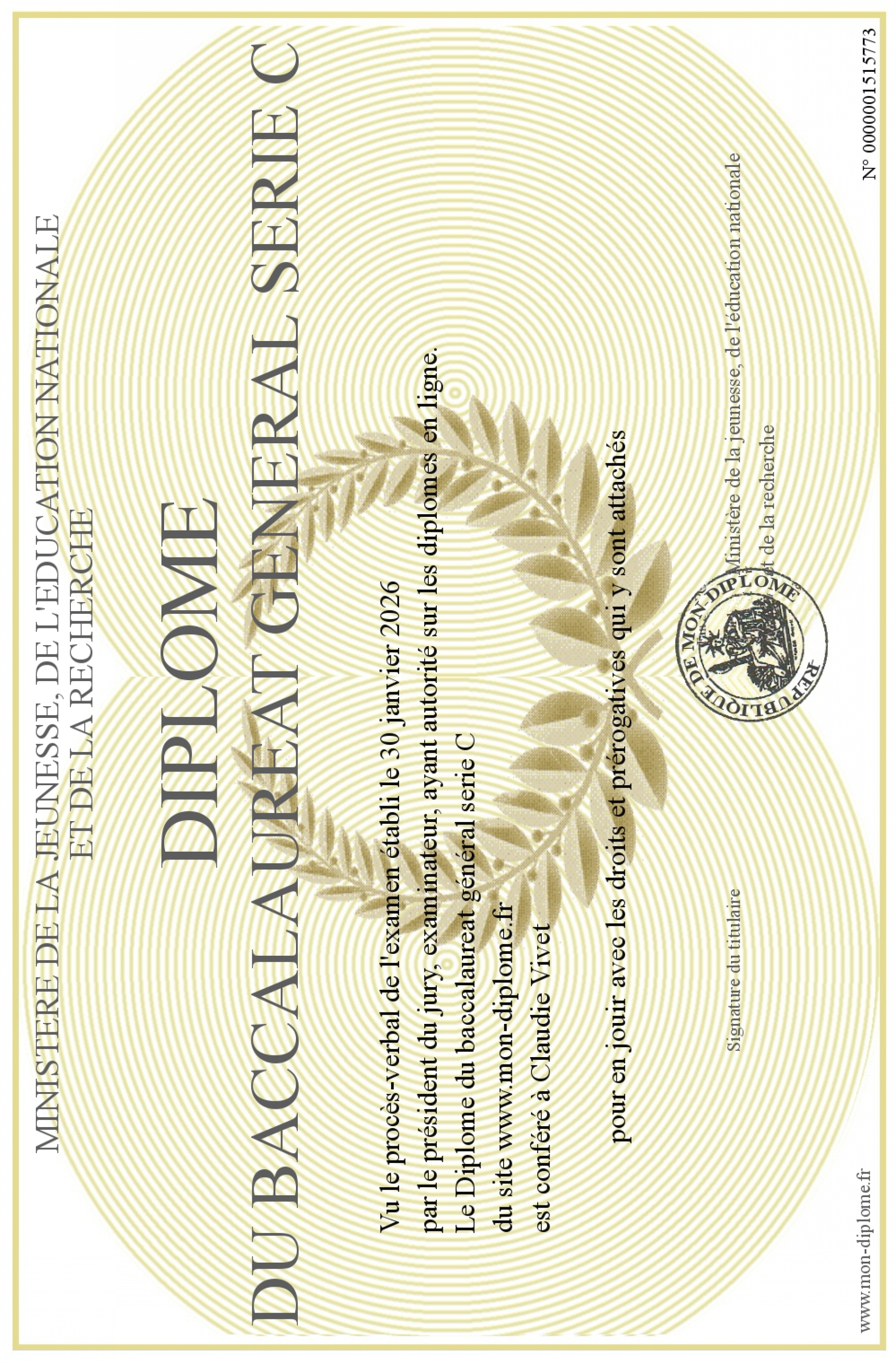 Envoyez par email votre Diplôme du baccalaureat général serie C personalisé