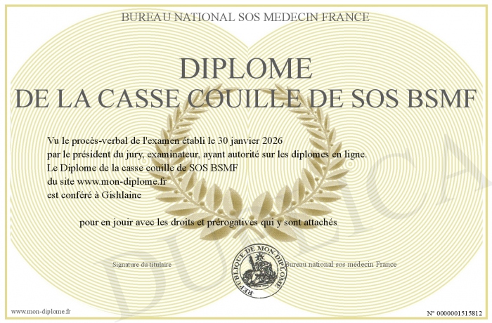 Envoyez par email votre Diplôme de la casse couille de SOS BSMF personalisé