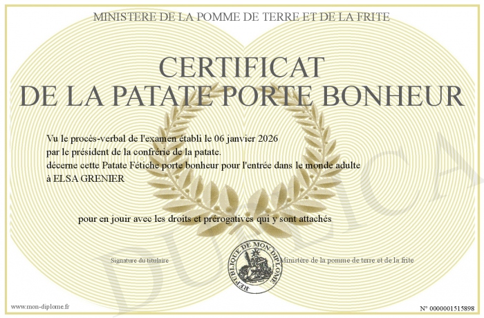 Envoyez par email votre Certificat de la patate porte bonheur personalisé