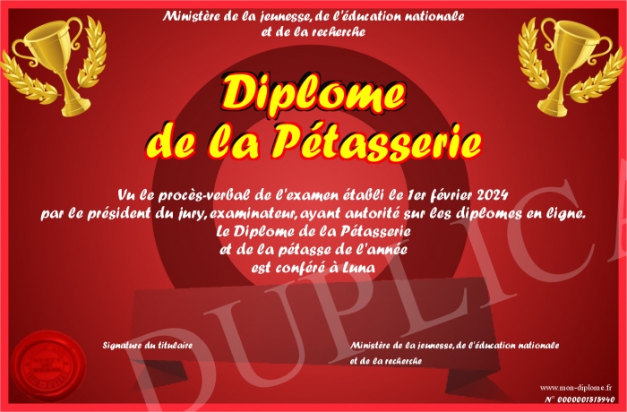 Envoyez par email votre Diplôme de la Pétasserie personalisé