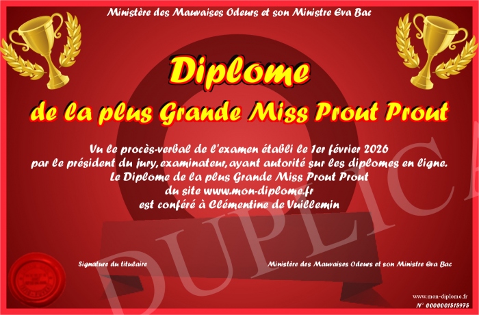 Envoyez par email votre Diplôme de la plus Grande Miss Prout Prout personalisé
