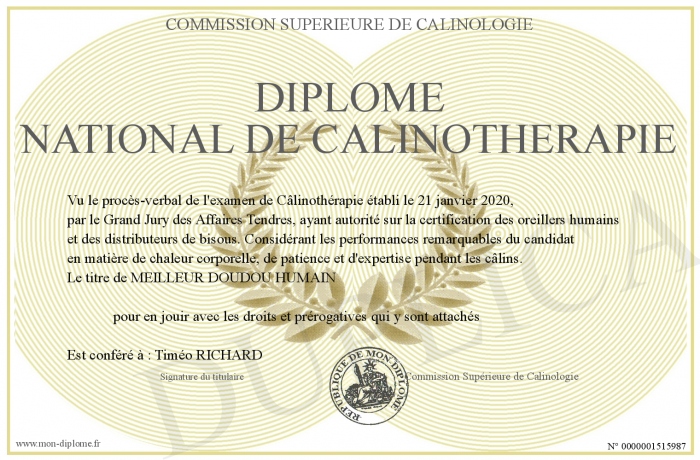 Envoyez par email votre Diplôme national de Calinothérapie personalisé