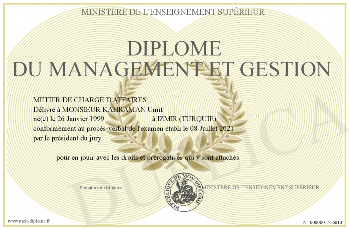 Envoyez par email votre Diplôme du MANAGEMENT ET GESTION personalisé