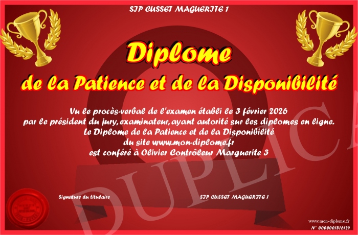 Envoyez par email votre Diplôme de la Patience et de la Disponibilité personalisé